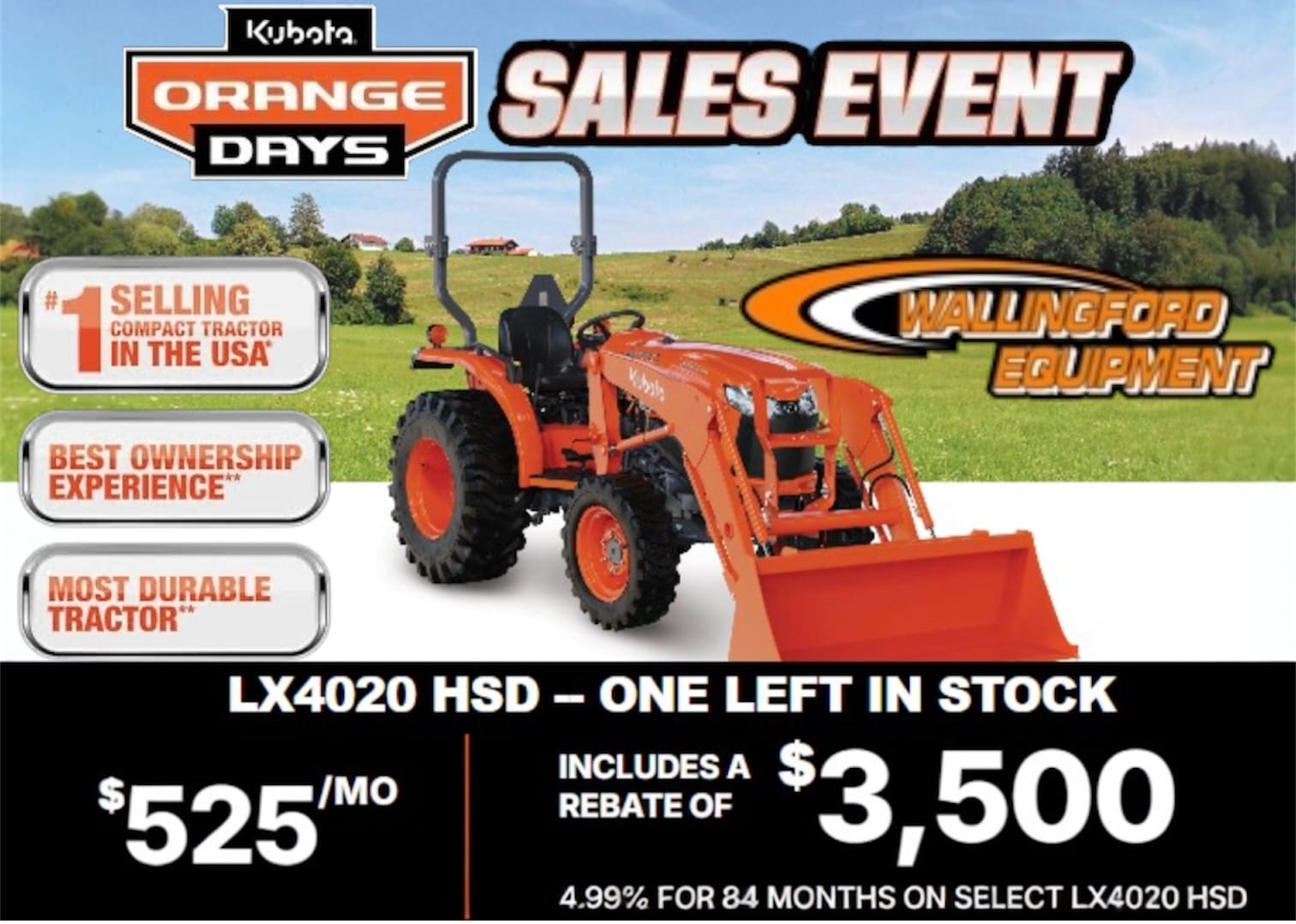 Based on EDA/UCC Data from 01/01/2020 – 12/31/2024 for sales of new tractors 0-200 Hp in the USA.©️ Kubota Tractor Corporation, 2026. $0 Down, 0% A.P.R. financing for up to 84 months on purchases of new Kubota LX4020 HSD w/ Loader equipment dealers’ in-stock inventory is available to qualified purchasers through Kubota Credit Corporation, U.S.A.; subject to credit approval. Example: 84 monthly payments of $13.86 per $1,000 financed. Customer instant rebate of $3,500 on Kubota LX4020 HSD w/ Loader available with cash or standard rate financing. Offers expire 06/30/26. Terms subject to change. For complete warranty, disclaimer, safety, incentive offer and product information, consult Wallingford Equipment Co..
